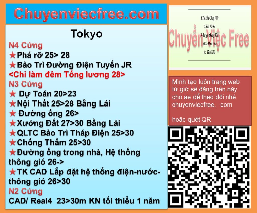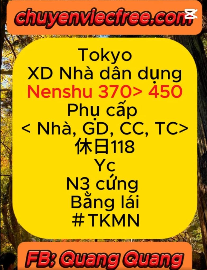 - Tokyo Cải Tạo #TKMN Nenshu 450>TokyoCty tập đoàn lớnChuyên mảng Cải tạo Nhà, Chung cư, Bệnh Viện….Phụ Cấp NhiềuDeal lương OkYCKaiwa tốt N3 cứng ~… Đọc thêm: Tokyo Cải Tạo #TKMN Nenshu 450>