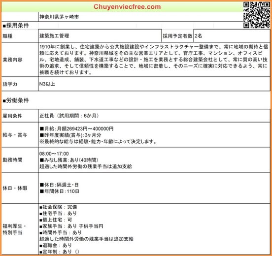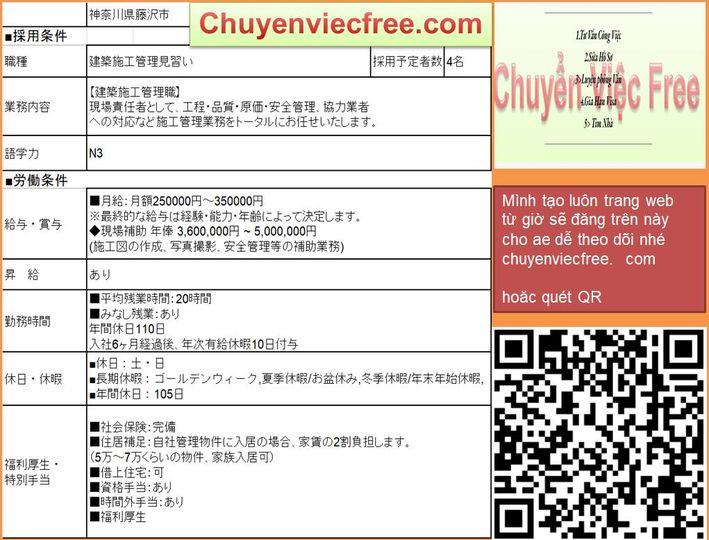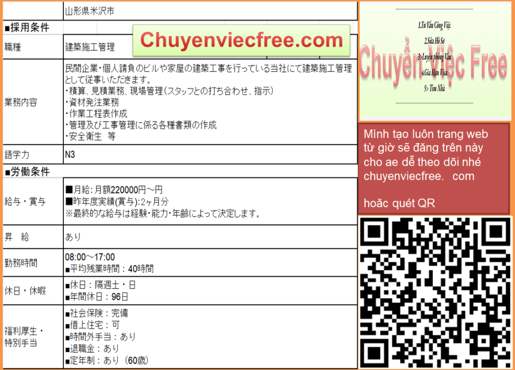 - 10100 Yamagata QLTC Tổng 27 31mQLTC/ Thi Công建築・土木 Lương 22> 25Tăng ca 40 tiếng tính riêngTổng 27>31 Deal lương theo năng lực Phụ Cấp Có Nhà/ Kí Túc Yêu Cầu N3 Kinh Nghiệm Đào tạo từ đầu 年収 350>400 Bằng Xây Dựng
