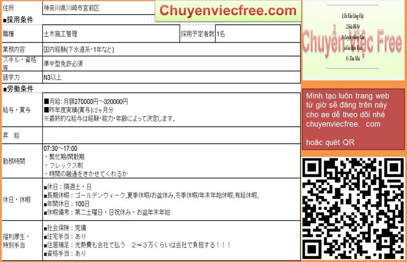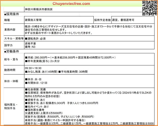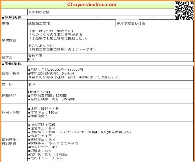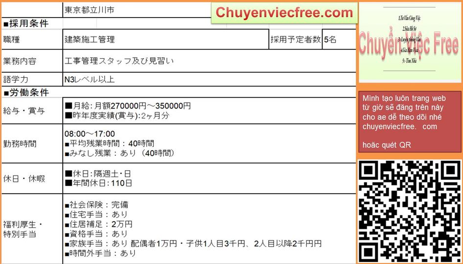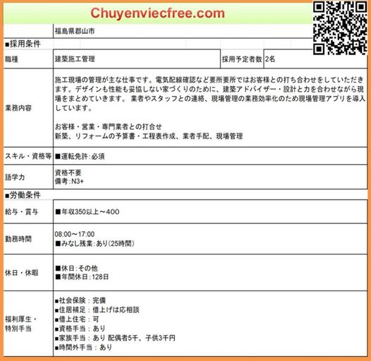 - 15905 QLTC Dân DụngQLTC/Thi Công Lương 25> 35Man Deal lương theo năng lực Phụ Cấp Có Nhà/ Kí Túc Trao Đổi Sau Yêu Cầu N4 cứng trở lên Kinh Nghiệm Đào tạo từ đầu OK 年収 300>450 Bằng Xây Dựng