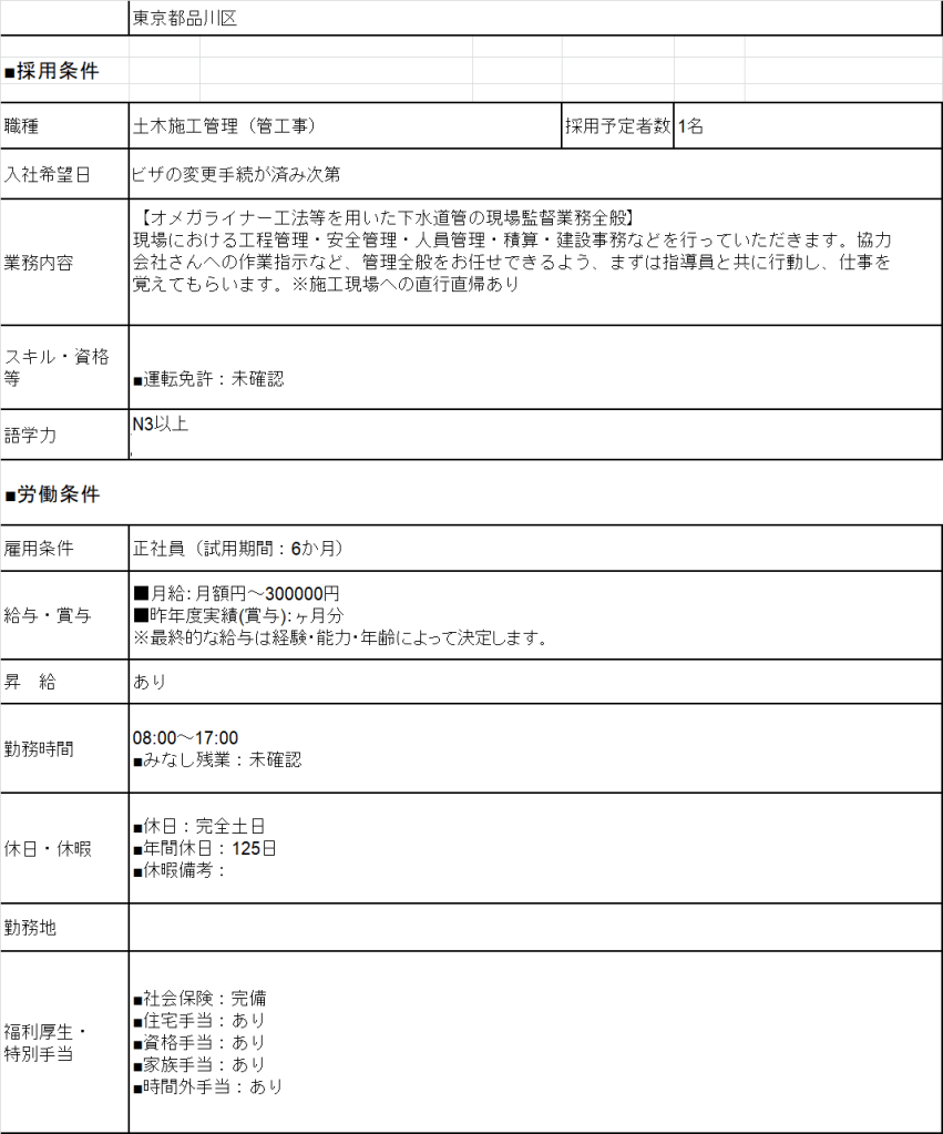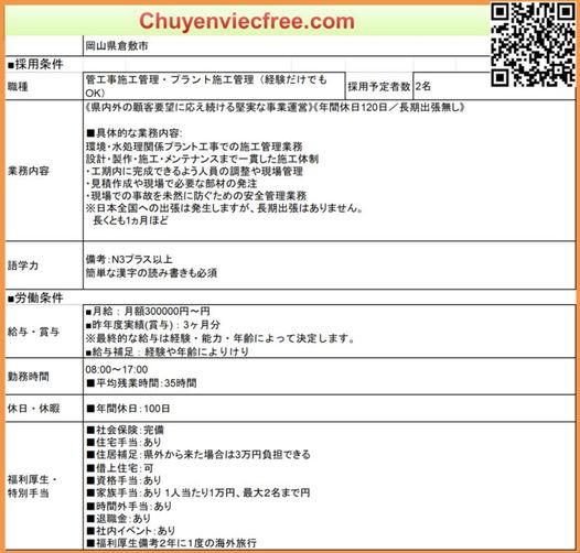 - 1427 Đường Ống Tokyo 28mQLTC/Thi CôngHệ thống cấp thoát nước đô thị Lương 28Man > Man Deal lương theo năng lực Phụ Cấp Có Nhà/ Kí Túc Có Yêu Cầu N3 CứngCông việc có 出張 Kinh Nghiệm Đào tạo từ đầu OK 年収 400> Bằng Xây Dựng