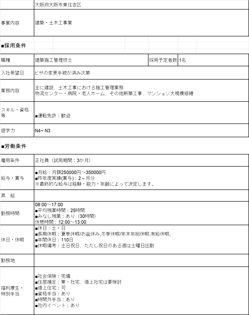 - 14957 QLTC Osaka 400m>QLTC 100% Lương 26>300 Man Deal lương theo năng lực Phụ Cấp Có Nhà/ Kí Túc Có Yêu Cầu N3 Cứng Kinh Nghiệm Đọc vẽ CAD cơ bảnKN QLTC 年収 400>>> Bằng Xây Dựng