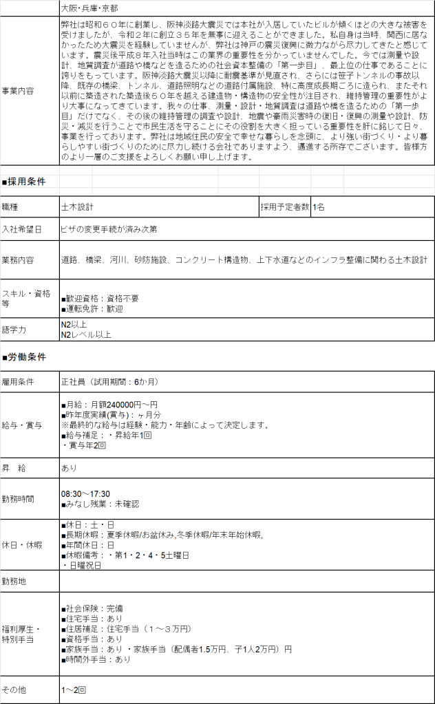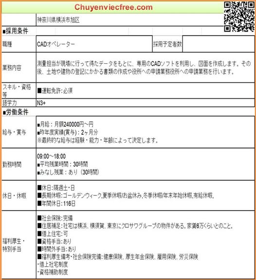 - 15070 Thiết Kế 土木Osaka – Hyogo – KyotoThiết Kế 土木 Lương 24> Man Deal lương theo năng lực Phụ Cấp Có Nhà/ Kí Túc 3m Yêu Cầu N2 Kinh Nghiệm KN tối thiểu 1 năm 年収 Bằng Xây DựngBằng Lái