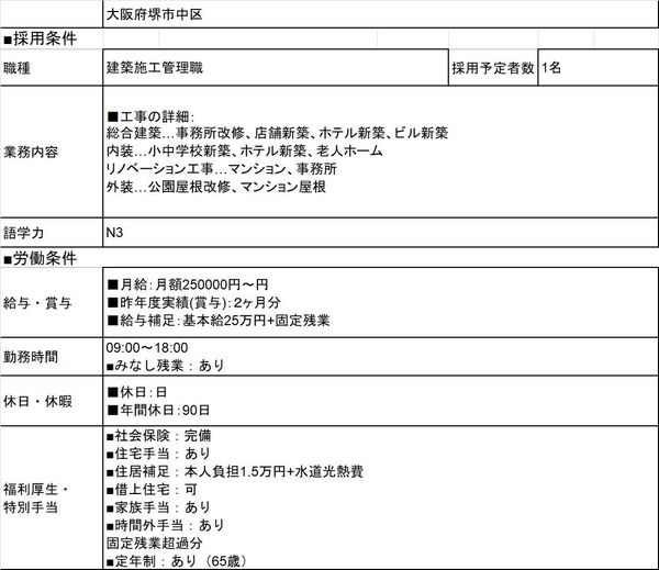 - 15935 QLTC/Thi Công 30mQLTC đã đủTuyển thêm vị trí thi công Lương Tổng30 m > Deal lương theo năng lực Phụ Cấp Có Nhà/ Kí Túc Thuê hộ OK Yêu Cầu N4 Cứng Trở lên Kinh Nghiệm Đào tạo từ đầu 年収 400 以上 Bằng Xây Dựng