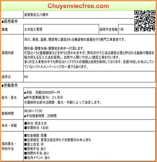 - SHIGA 16939 QLTC/Thi công16939QLTC/Thi công 土木Ctty có 4 ng Việt đang làmL 25+ OT tính riêng+ Phụ Cấp : GD , 出張Nhà F.ree< chỉ phải trả điện nước ga>出張 trung bình 10 ngày, tối đa 2 thángCó phụ cấp 出張DK Duy nhất N4 cứng N3 kaiwa