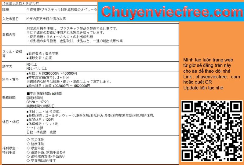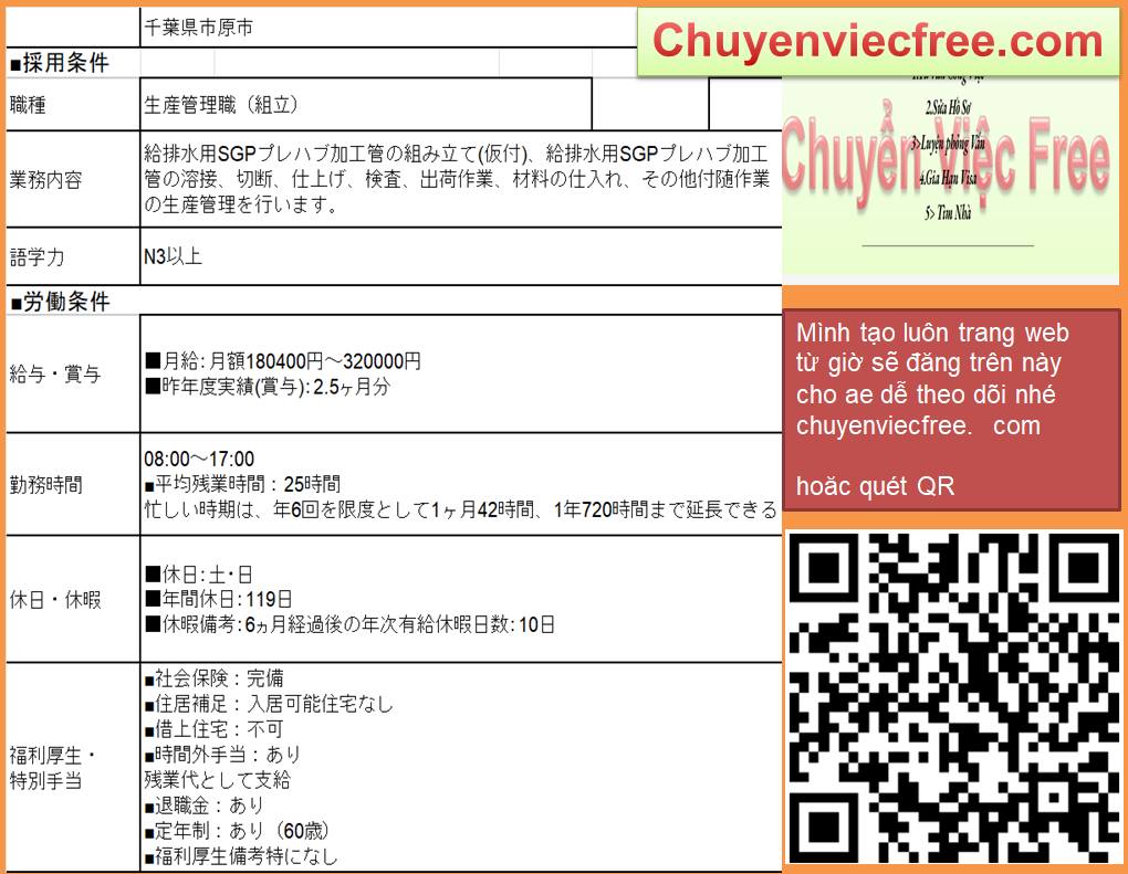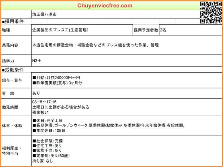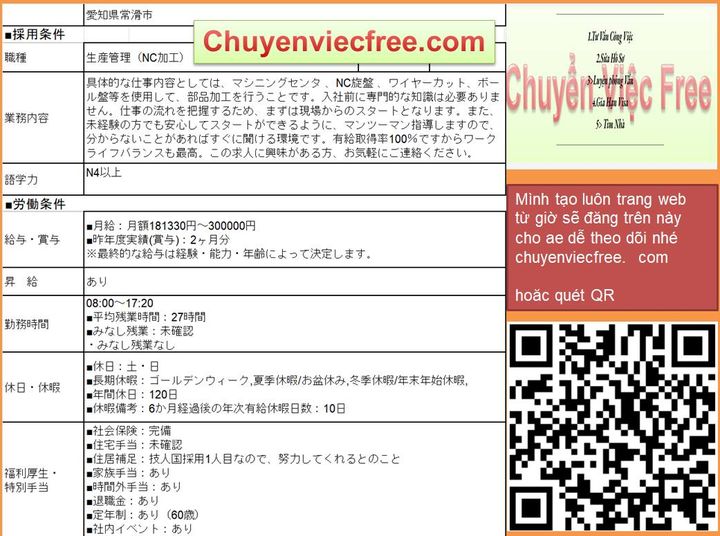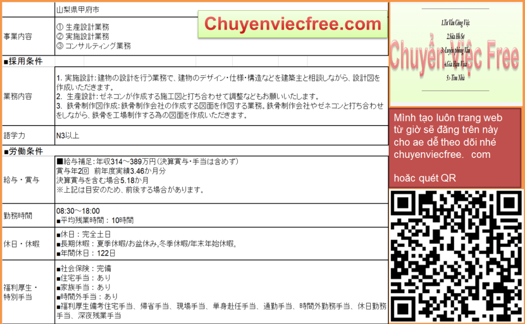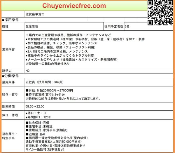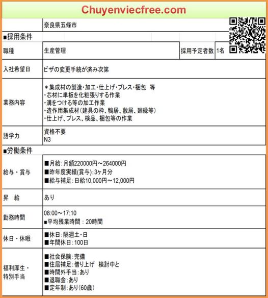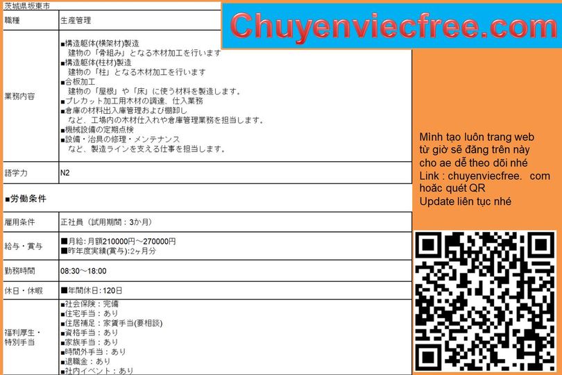 - 8112 Ibaraki Xưởng GỗThi Công Dầm Gỗ/ Trụ/ Cột GỗĐồ gia dụng Lương 21>27 Man Deal lương theo năng lực Phụ Cấp Có Nhà/ Kí Túc Có Yêu Cầu N3 Cứng ~N2 Kinh Nghiệm CAD Thành Thạo 年収 350>450 Bằng Điện/ Cơ Khí/Xây Dựng